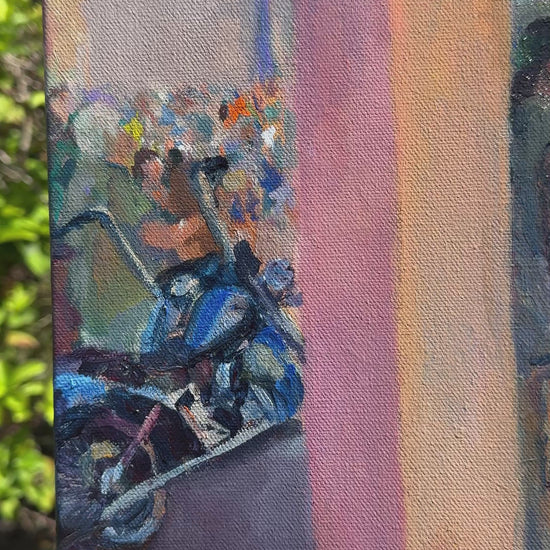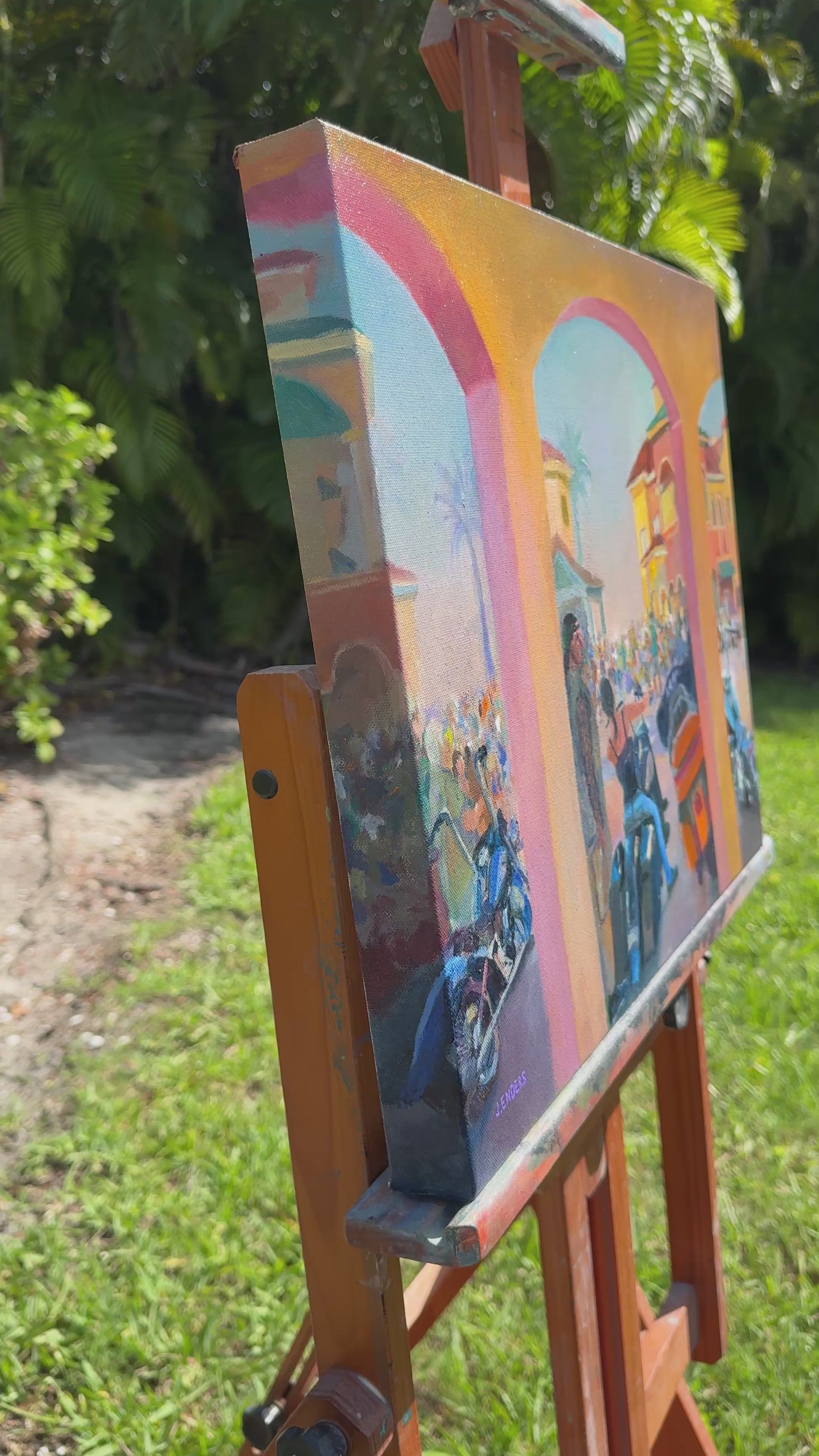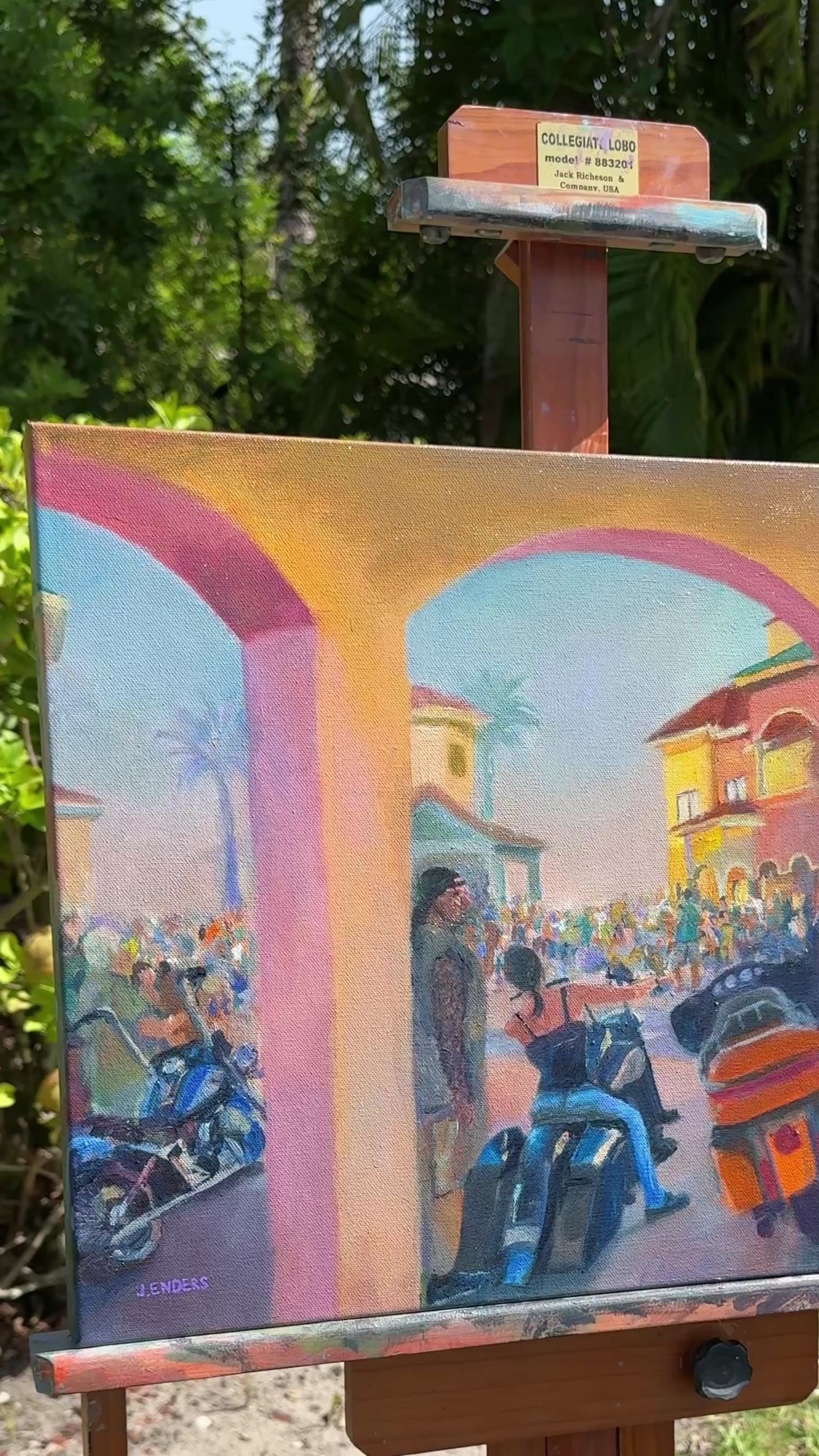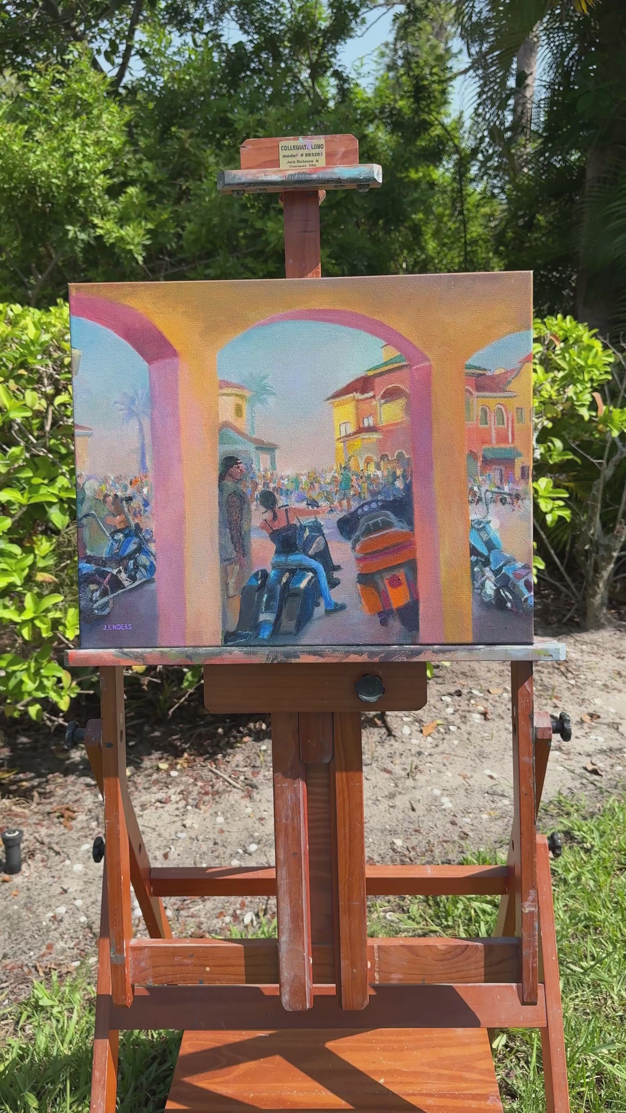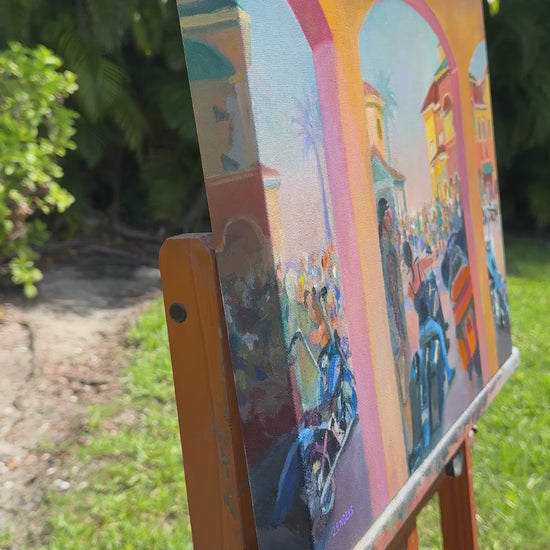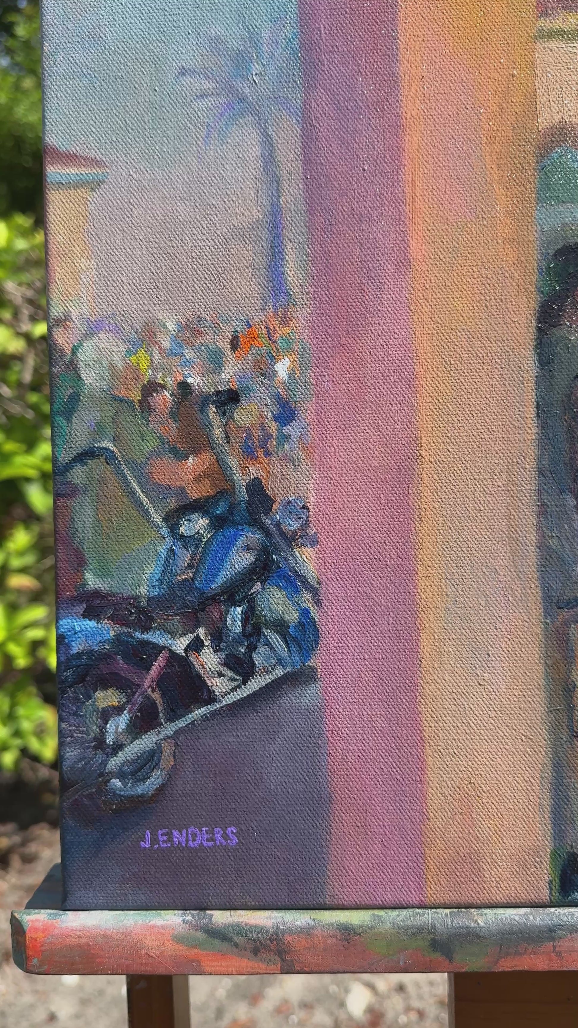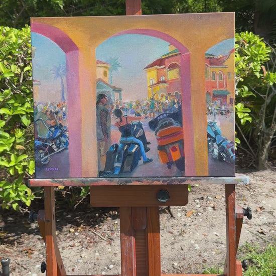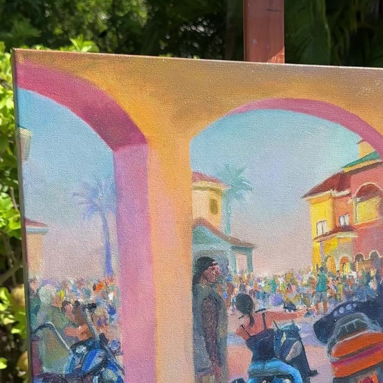 This colorful acrylic painting capturing the lively atmosphere of an evening at Cape Harbour in Cape Coral, Florida. The scene is viewed through warm-toned archways, framing a bustling plaza filled with people, motorcycles, palm trees, and vibrant Mediterranean-style buildings. In the foreground, a man in biker gear stands beside a woman sitting on a motorcycle, surrounded by other bikes. The artwork uses bold strokes and rich hues of orange, pink, and blue to evoke the festive, sun-soaked energy of the event.
